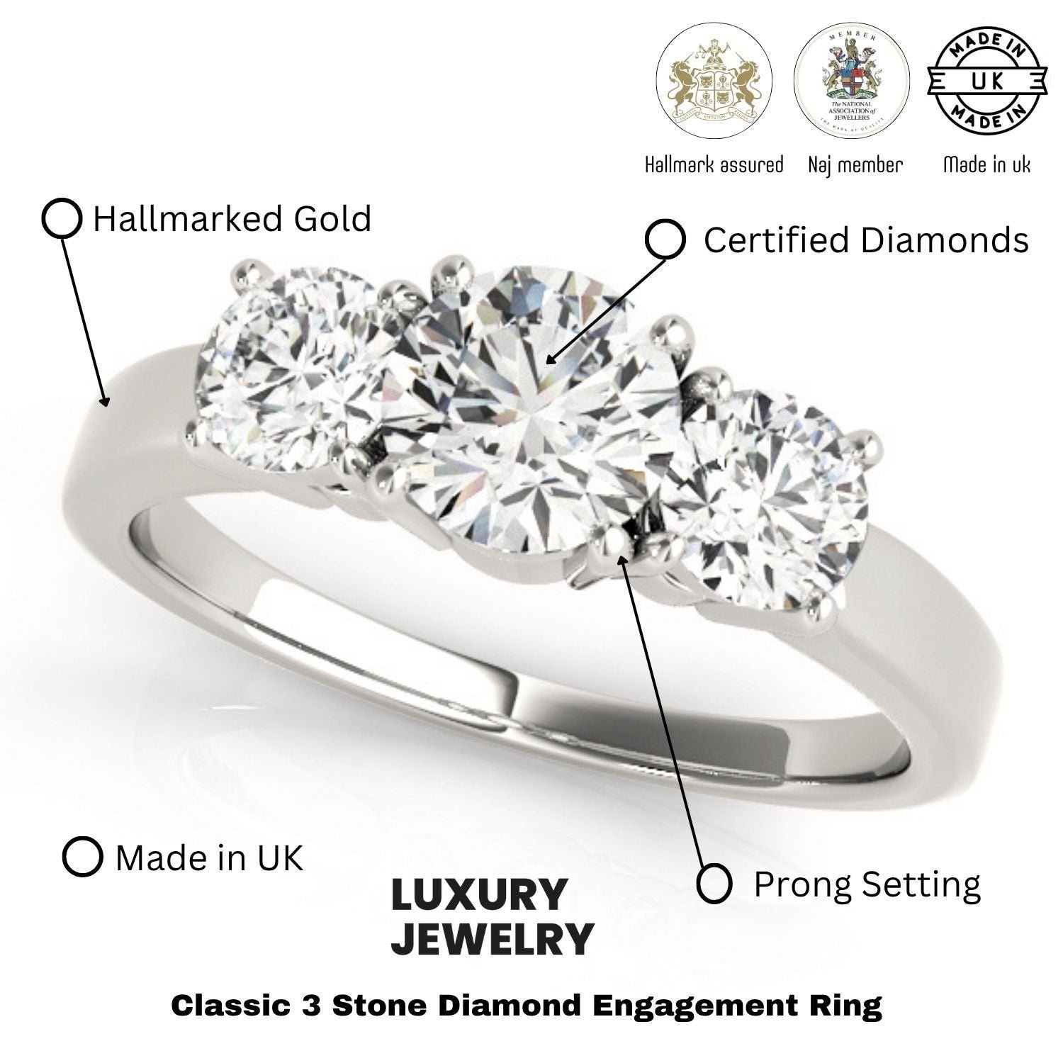 This trilogy engagement ring is perfect for those seeking luxury, sustainability, and a timeless design. Made in the UK and hallmarked by the UK Assay Office, it guarantees both authenticity and top-tier craftsmanship.