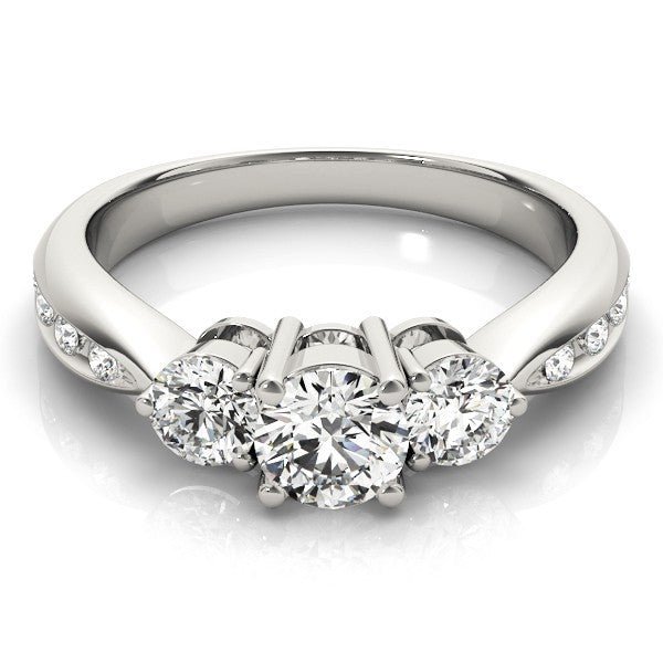 This DE/VS Lab Grown Round Diamond Trilogy Engagement Ring is designed with three stunning round diamonds representing the past, present, and future. The side round diamonds on the band enhance the overall brilliance, providing a continuous line of sparkle that creates an elegant, radiant effect.