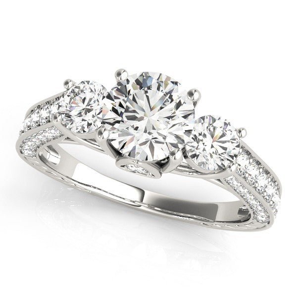 This beautiful DE/VS 3-stone engagement ring features a round center diamond and two side diamonds in a trilogy design„a symbol of the past, present, and future of your love. The side diamonds are a mix of princess and round cuts, set in a prong setting to maximize the brilliance of each stone.